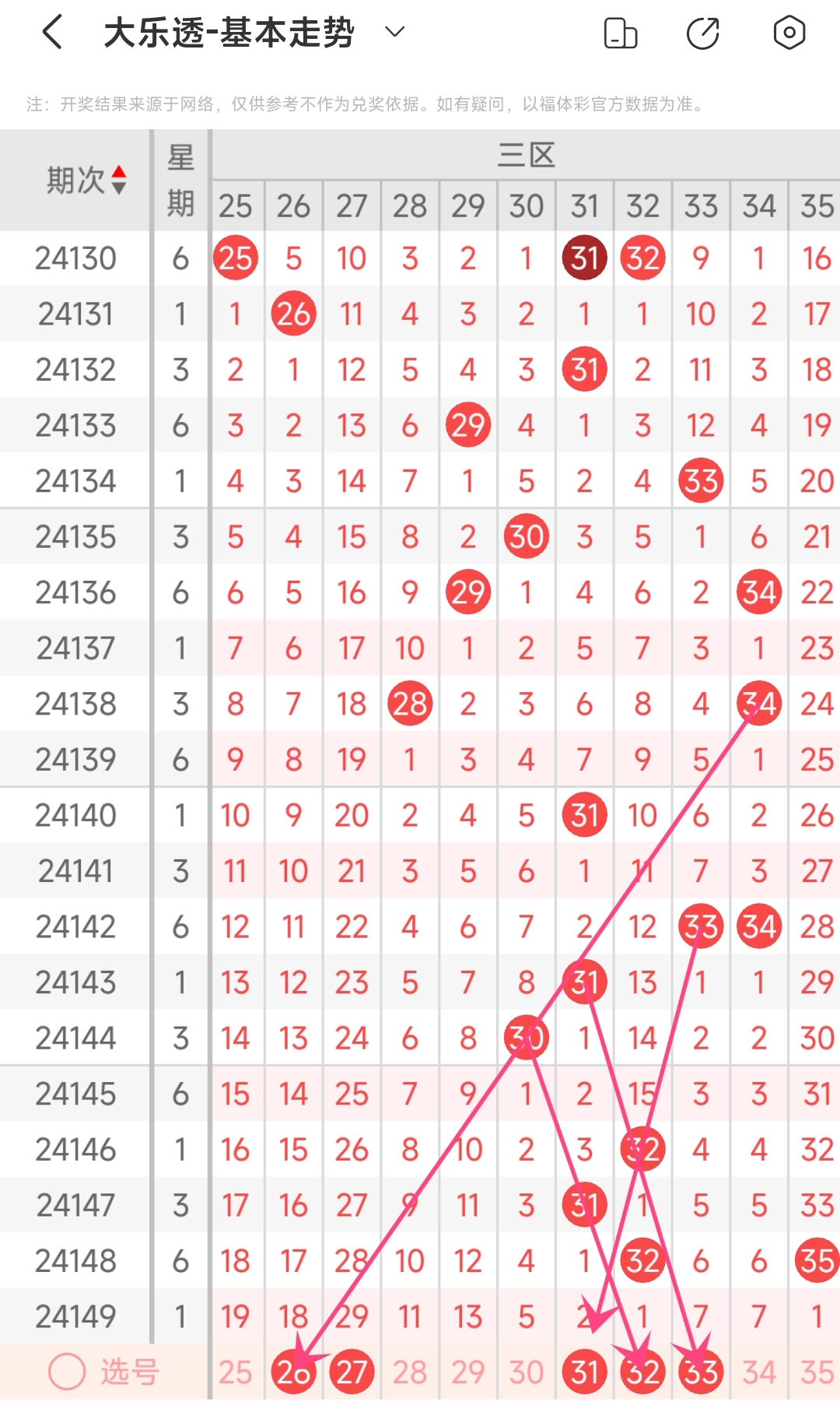三区间上期(24149期)跳空,本期做号需要注意连号位置如何落码,以及空白区域号码回补落码,从近期该区间跳空来看,在24139期跳空后下期开出独码,在24141期跳空后下期开出跳空斜连走势,在24145期跳空后下期开出跳空斜连走势,本期斜连位置号码需要仔细研判考虑,本期首先需要关注的号码【26】遗漏十八期冷号带斜连走势,【27】遗漏二十九期冷号,然后是【31】二期回补号码带斜连走势,其次是【32】隔期回补号带斜连走势,【33】七期回补号码带斜连走势,本期重点关注号码【26 27 31 32 33】