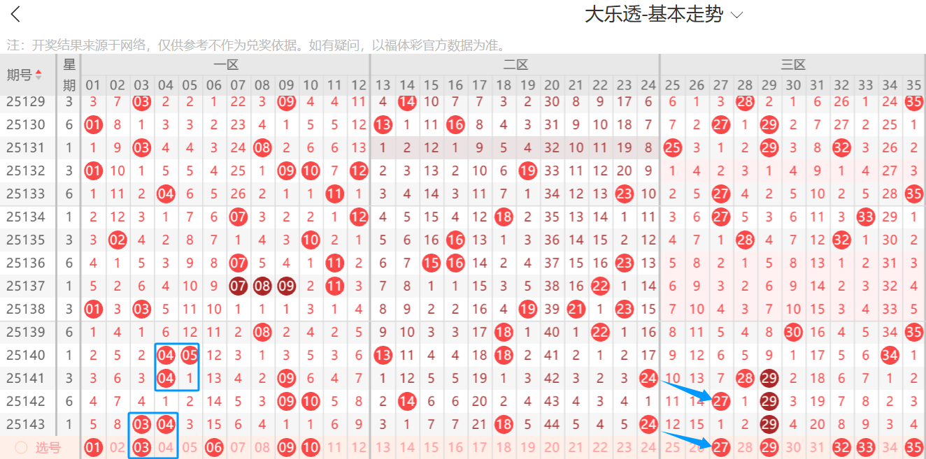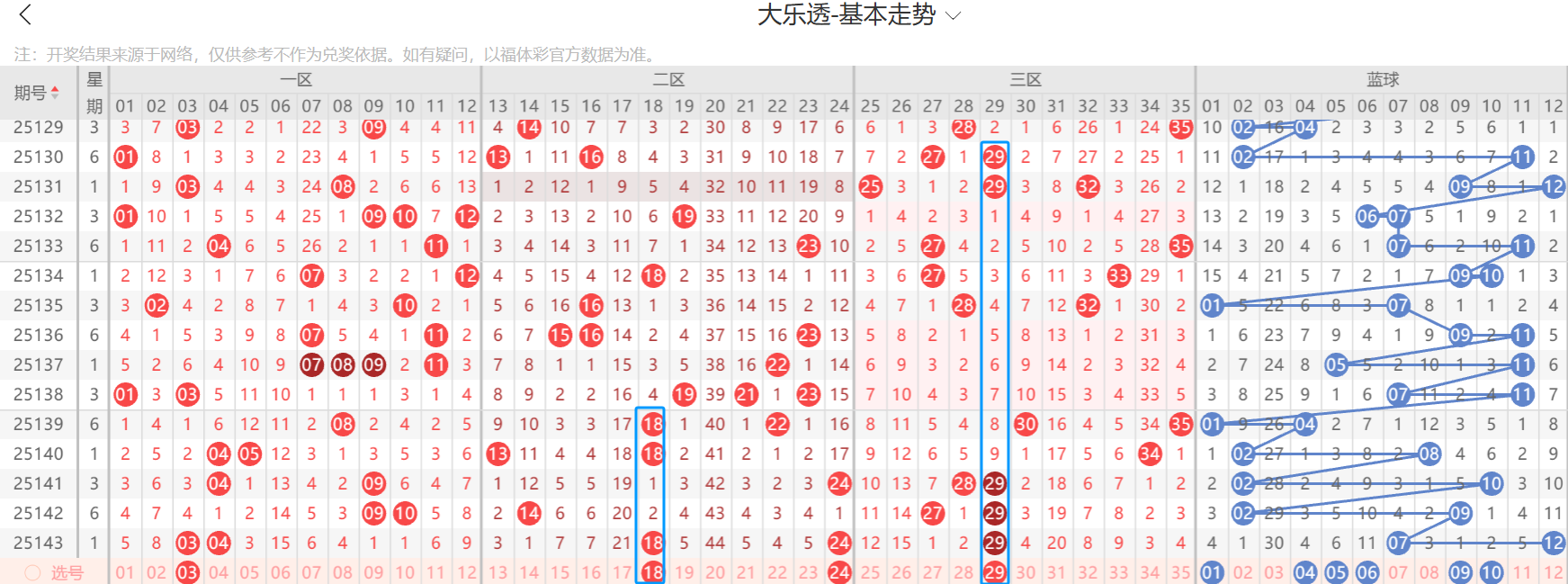 龙头凤尾:上期的龙头主看4,没有看0路所以错失3,本期的龙头关注0路,比如这个3是不是跟之前的45回补4形态如出一辙呢,其次关注9.10回补出号,假如不看好0路的,那么可以考虑一路号,看0路就是顺势而为,凤尾连续出三期二路号,大概率还有机会,那么本期的29.32.35需要好好仔细看看了,其次假如0路考虑这个27是24的忠实跟随号,另外,我认为还是需要防守满跨开出,距离上次大乐透开满跨已经有很长时间了,那么是不是要考虑下这个1的龙头跟35的凤尾呢。
