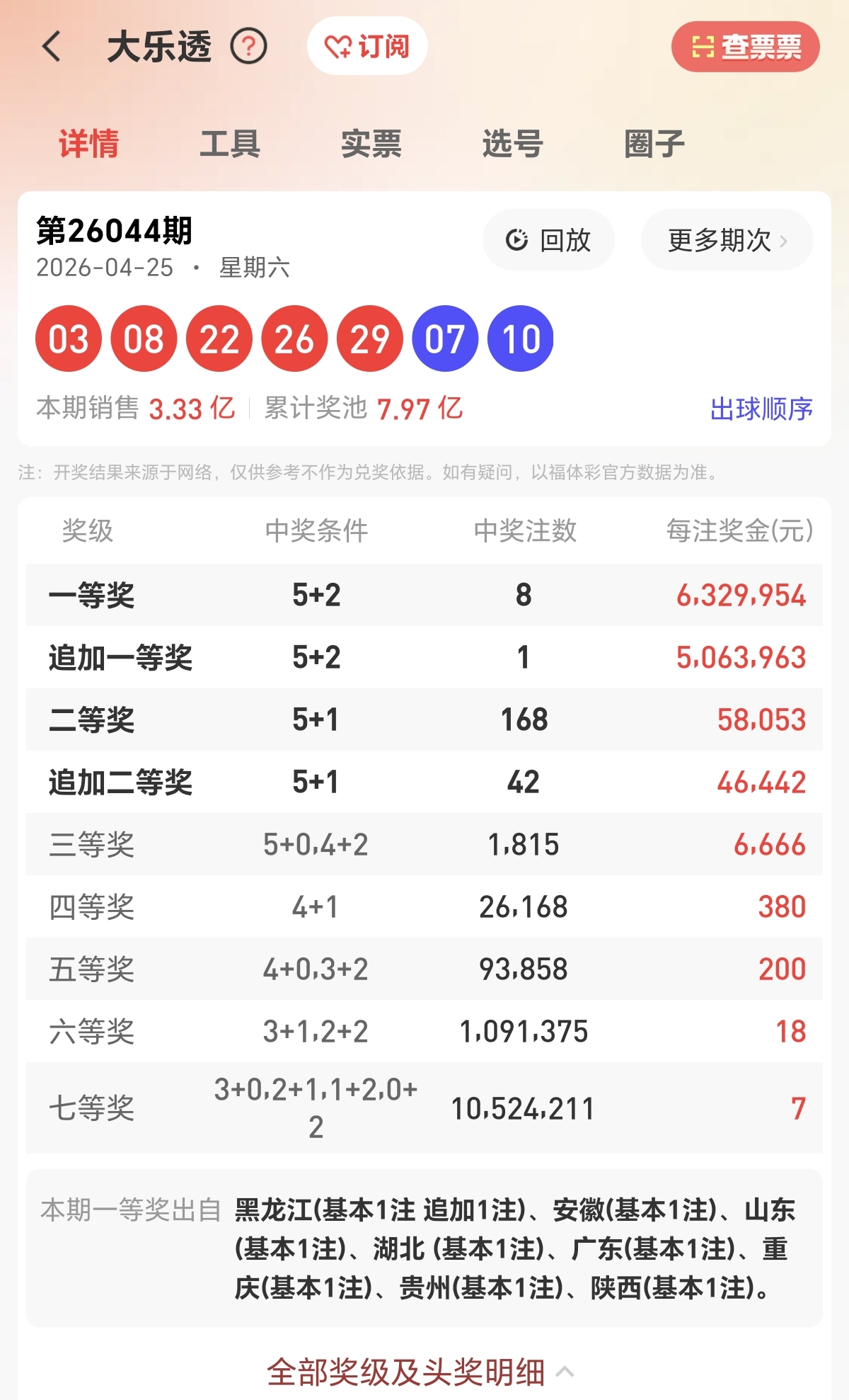 开奖:03 08 22 26 29 – 07 10