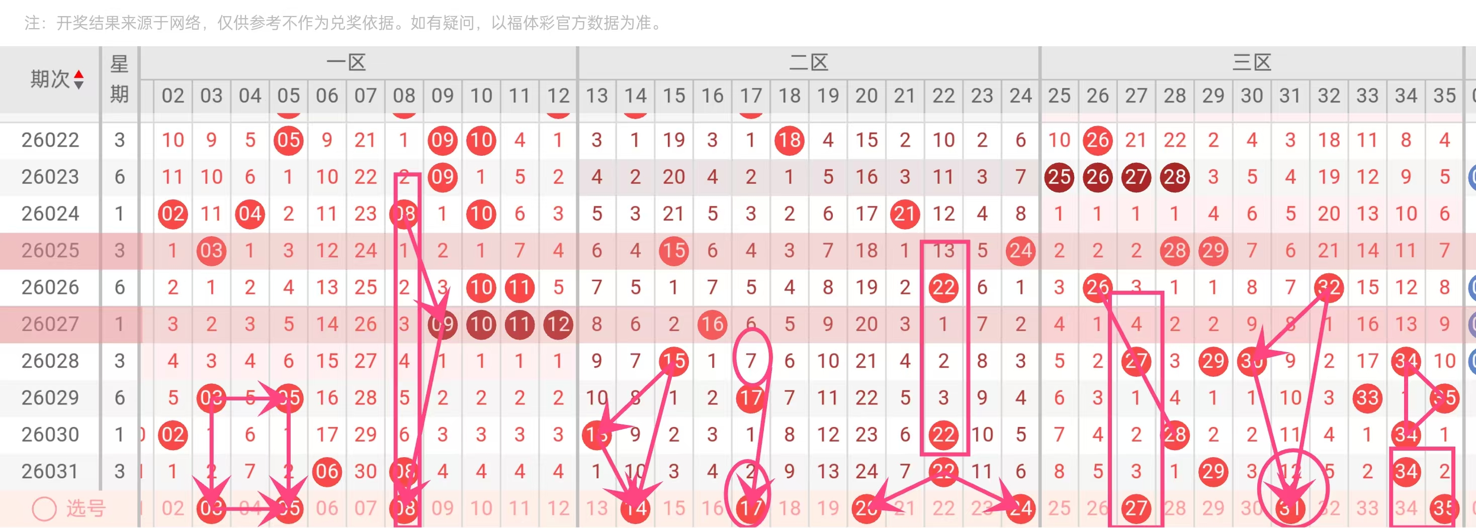 三区(25-35):选取 27 31 35,27为冷号,31为温号,35为边缘大号,避免全集中在中段。