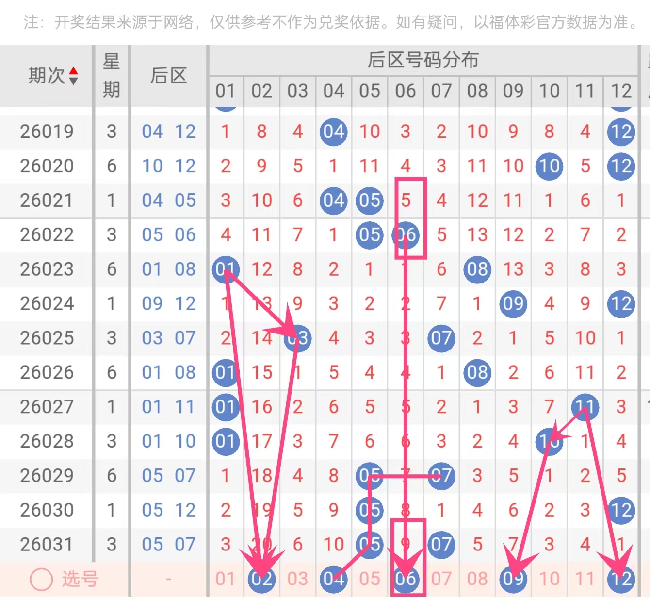 推荐后区奇偶比为1:4(仅09为奇),跨度覆盖2、4、6、10,避免单一形态,可灵活组合为02+09(跨度7)、04+12(跨度8)、06+09(跨度3)等常见跨度。