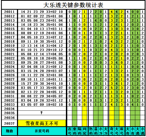 以下是作者手工统计的大乐透关键参数统计表,对喜欢参数分析、过滤缩水、选号胆杀的技术性大乐透爱好者有所帮助,其它读者可略过不看。