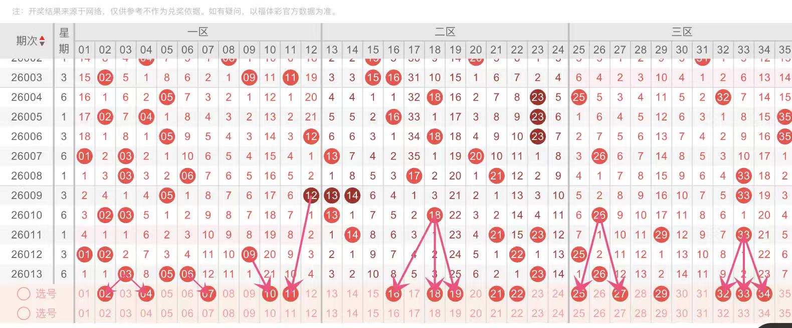上期开奖:大乐透第 2026013 期开出奖号: 03,05,06,23,26+01,04,其中红球号码大小比为 2:3,奇偶比为 3:2,区间比为 3:1:1, 012 路 比 2:0:3,和值为 63,跨度为 23,蓝球开出1 路转 1 路号。