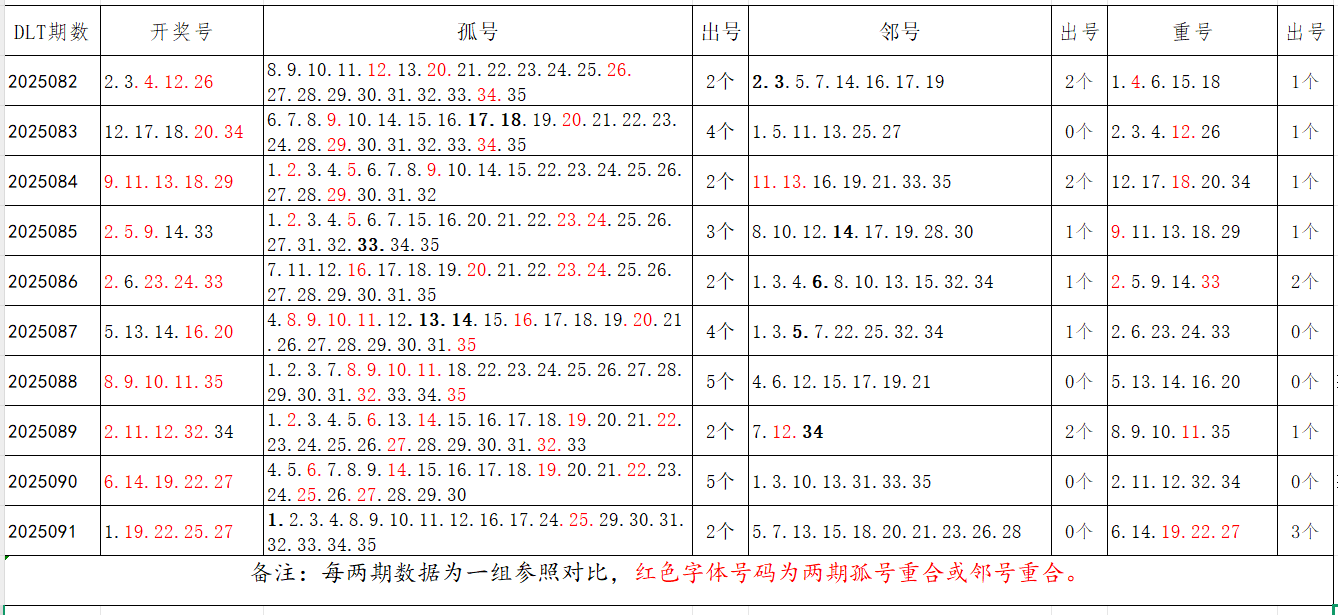 如图,以近两期数据为一组,进行对比分析,相同的孤号、邻号可能在下期开出。本期参考孤号:3.4.5.6.7.8.9.10.11.12.13.14.15.16.17.29.30.31.32.33.34.35;邻号:2.18.20.21.23.24.26.28。重点关注:孤邻号重合号码:***(会员专区可见)。个人分析,仅供参考。