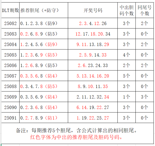 分享第三个数据分析:依据推荐的胆尾,推定胆码号码。每期计算出5个胆尾,做为推荐胆尾。以近10期推荐胆尾的统计数据为例: