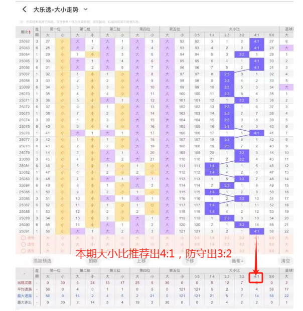 6、大小比:上期开出大小比为4:1,近49期开出4:1出现17次,3:2出现22次,2:3出现31次,1:4出现20次,5:0出现2次,本期推荐出3:2,防守出4:1,本期重点推荐出4:1。