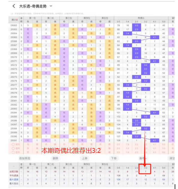 4、奇偶比:上期开出4个奇数为01 19 25 27 ,出偶数1个 22 ,一般开出奇数期数较长,奇偶比为4:1,近71期奇偶比为186:193,整体看偶数走势上升。本期重点看奇数强势。本期推荐出3:2,防守出4:1,本期重点关注3:2。