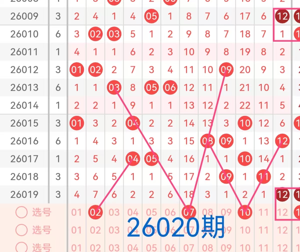 后区号码范围为01-12,分为两个区间:小号(01-06)和大号(07-12)。上期开奖号码为04和12,为一大一小的组合。