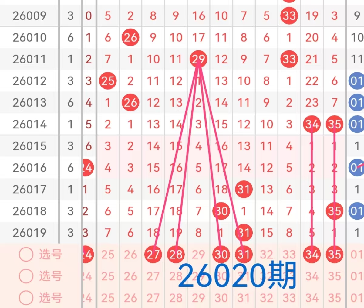 3. 三区(25-35):上期该区间开出一个号码31,号码31为该期的凤尾号码,在遗漏1期后再次开出,且与上期开出的号码30形成斜连走势。由于上期开出的凤尾号码相对中等,本期预计号码会由此左右徘徊,凤尾号码预计会在本区间出现,重点关注号码27、28、34、35。但是观察历史开奖来看,该区间近期出号较少,因此本期考虑仍然会有1-2个号码回补开出,特别是那些近期表现较热的号码,如号码30、31本期有望继续开出,因此它们有可能成为本期的出号热点。