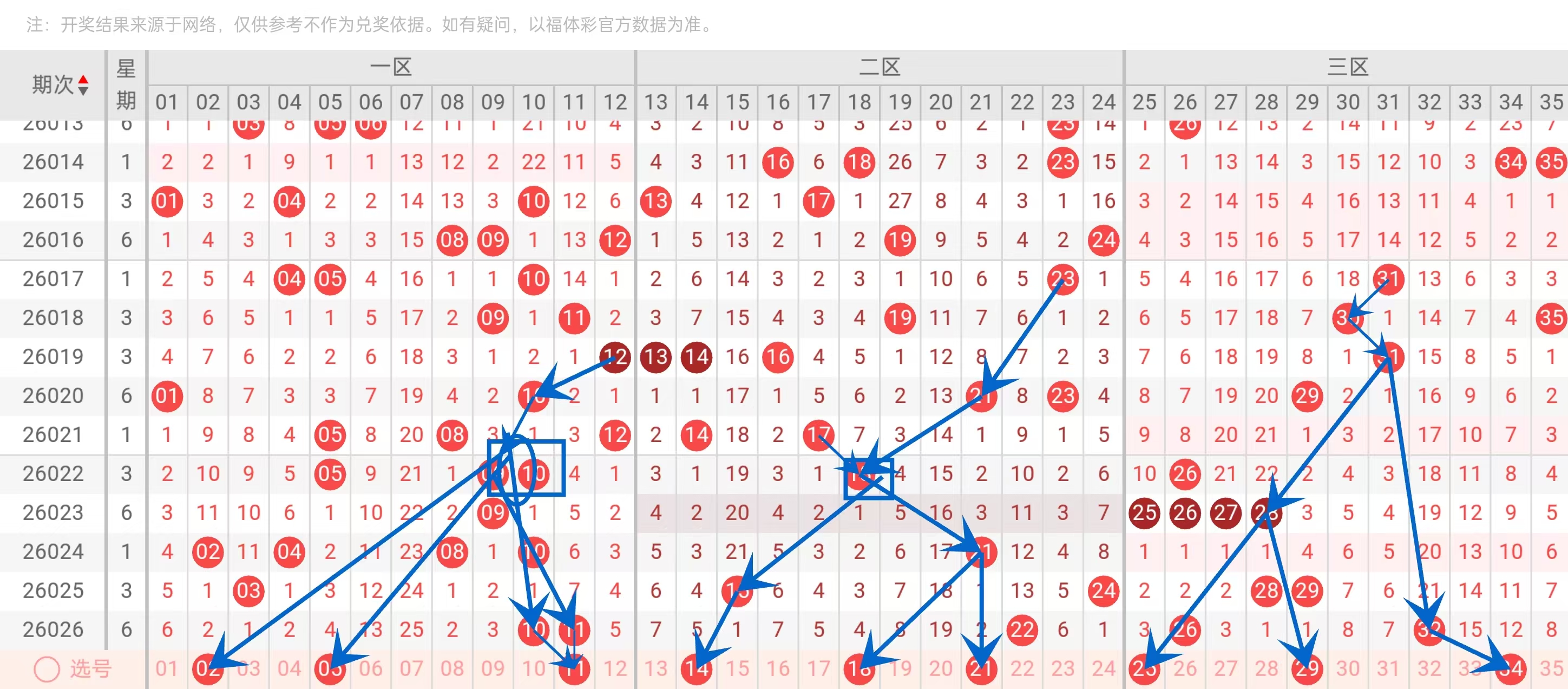 三区(25-35):选25、29、34,25为温号,29为斜连号,34为近期热尾号。