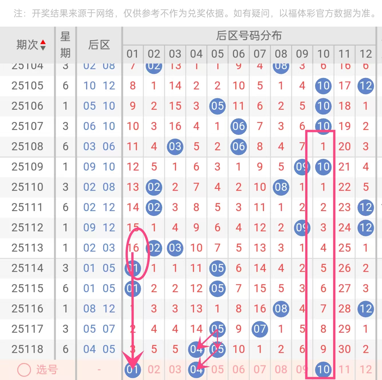 10:尾段号码,与01、04形成良好的跨度配合。覆盖后区不同数值区间,完善整体搭配结构。