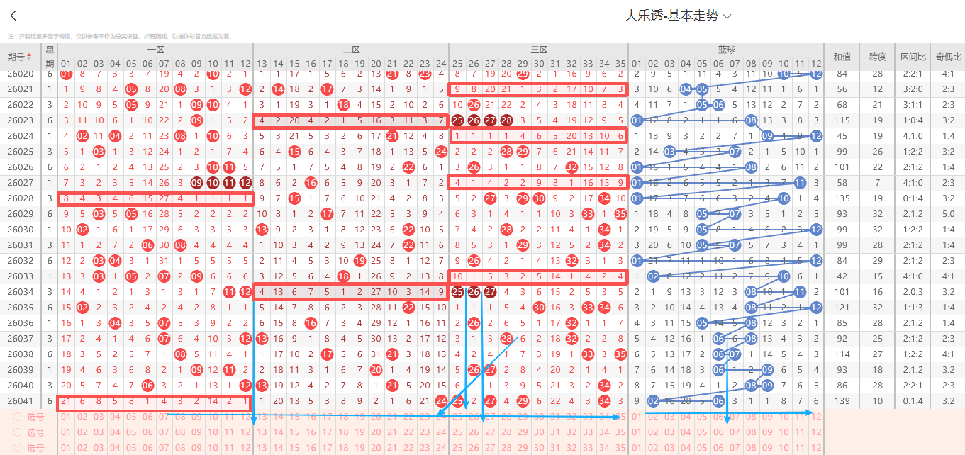 1、前区特征分析:(通过整体走势不难看出每期开奖号都具备以下明显的特征点)
