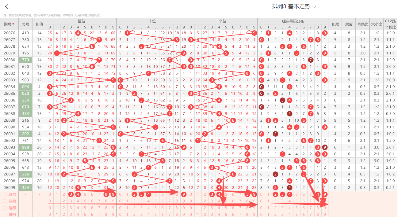 ①百位:上期开出大号偶数8号,在历史开奖记录中显示一般正常的奇偶周期平均在1~3期为普遍现象,上期出现奇偶互变开出偶数2路号码,依据奇偶以及012路周期性规律的转变特征点即本期0路号码有开出的趋势2路号码注意预防。