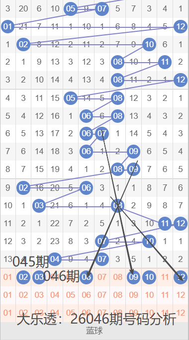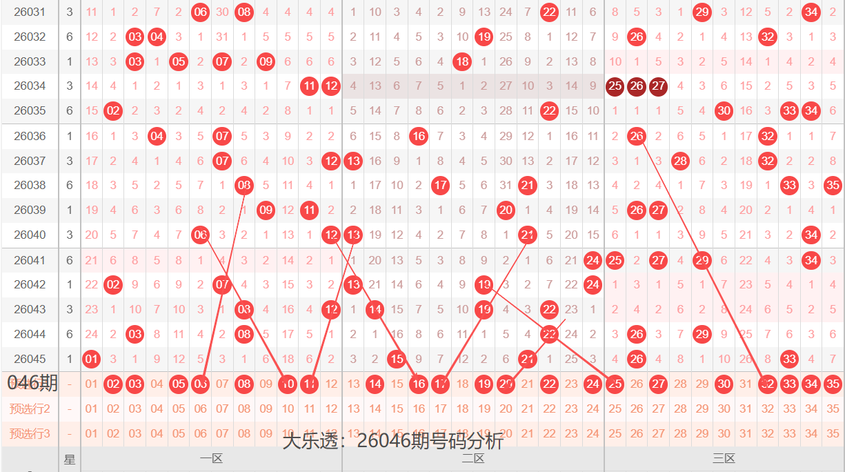 通过上期号码的简单分析,我们看下26046期红色号码球的总体走势,如下图: