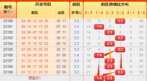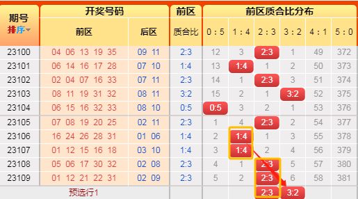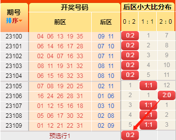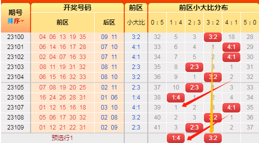 上期前区小大比2:3,抓住范围。言归正传我们继续用历史数据说话,前区小大比分成6种0:5、1:4、2:3、3:2、4:1、5:0(如图),我统计了一下历史出现次数,0:5出现99次、1:4出现449次、2:3出现884次、3:2出现700次、4:1出现298次,5:0出现44次,再看近10期小大比出现次数比为0:1:3:3:3:0,通过数据观察,近期0:5、5:0进入冷值,4:1开过短期内否定掉,剩下1:4、2:3、3:2还是低于历史比值,根据遗漏对称理论原则,故本期咱们选1:4或3:2;(如想进一步了解,请直接上车,今日无直播)