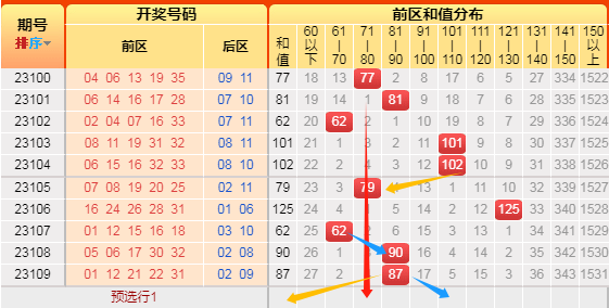 上期开出和值87,挺好,连坐了。本次我们先根据历史次数统计,和值60以下开出206次、61-70开出205次、71-80开出316次,81-90开出420次、91-100开出454次,101-110开出333次、111-120开出275次、121-130开出146次、131-140开出82次、141-150开出26次、150以上开出8次,再来看近十次以上和值分别开出了0次、2次、2次、3次、0次、2次、0次、1次、0次、0次、0次 ,低于阈值的有60以下区域、71-80区间、91-100区间、101-110区域、111-120区域、131-140区域,再根据遗漏斜率对称理论,所以我选择60以下区域、71-80区间或101-110区间。