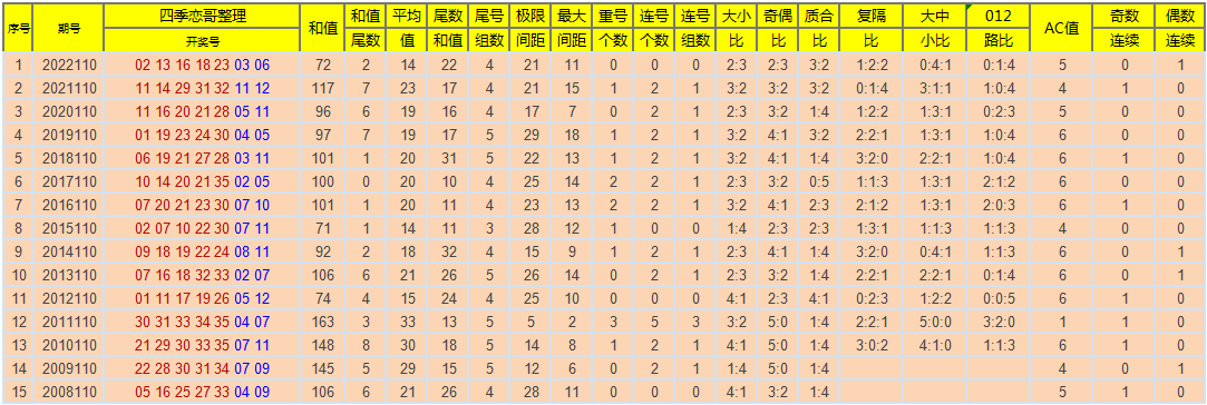下图为大乐透彩种诞生以来每年的110期各类数据及9月23日同时期各类数据,各位大佬及彩友们请拿走~