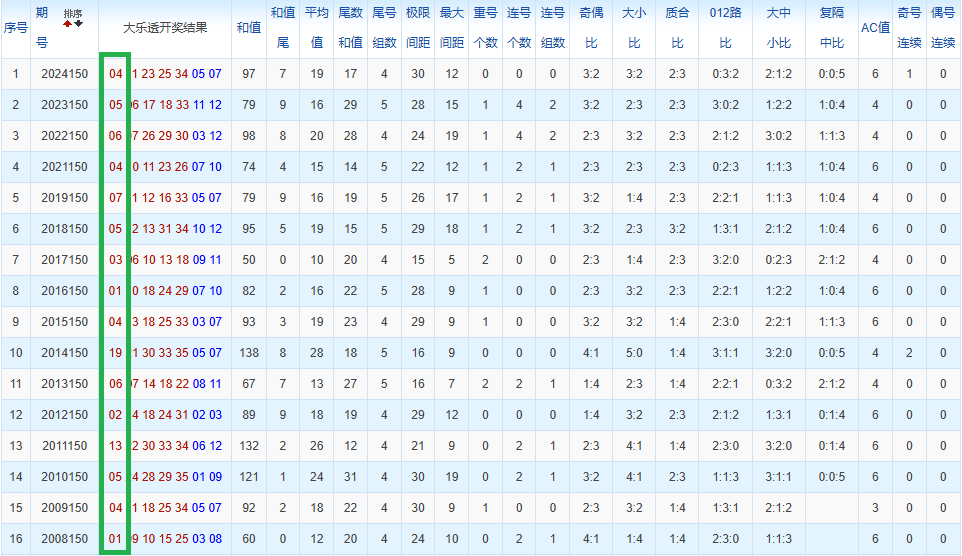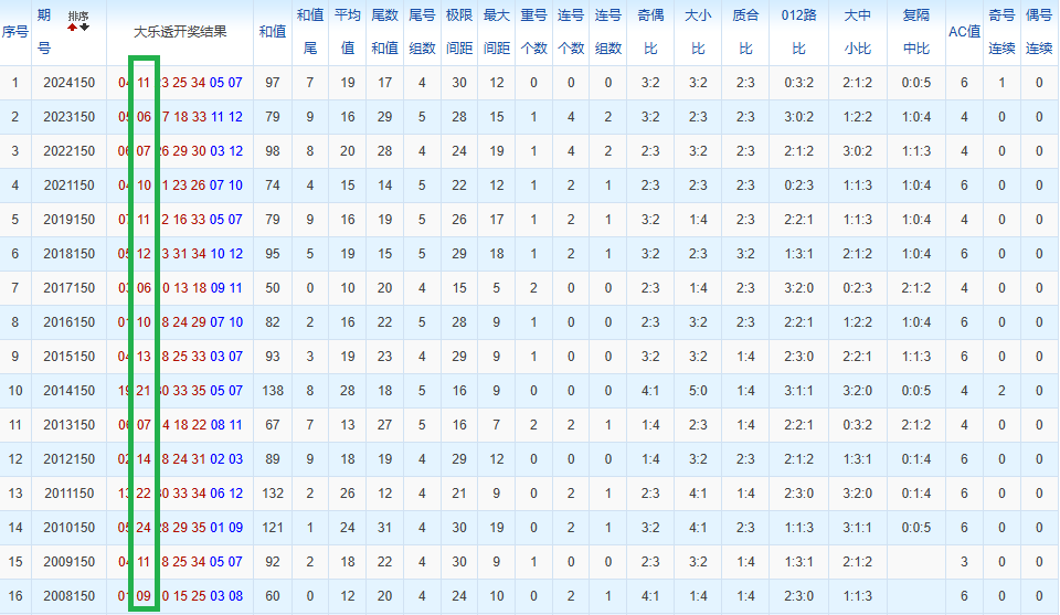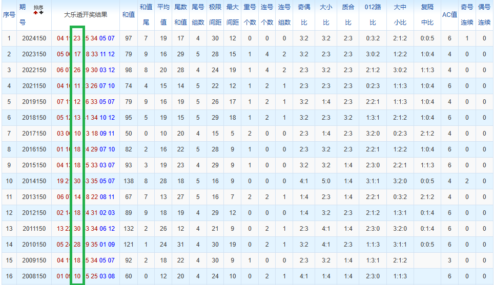通过观察,我发现往年同期的开奖数据与本期号码之间存在显著关联。具体来说,在前区号码中,从第一位至第五位,通常会有约三个位置上的数字与往年同期相同位置的号码一致;而后区号码中,也有多期开奖结果直接包含了往年同期的数字。因此,我们可以借助往年同期各位置上的号码,作为分析本期开奖情况的重要依据。在此基础上,还可结合往年同期的其他相关条件,进行综合性的号码组合推荐。