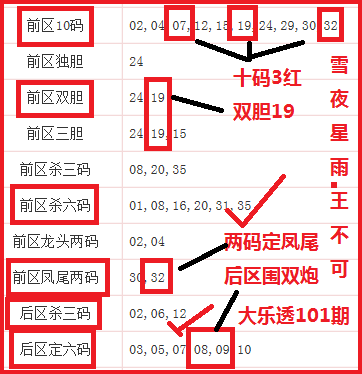 上期10码3红07 19 32,双胆19。两码定凤尾32,后区双炮08 09,前后区杀码全对。