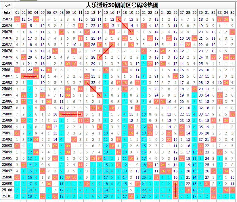 大乐透近30期前区号码冷热图(数字为遗漏期数,蓝色标记的为遗漏超过10期的大冷号)