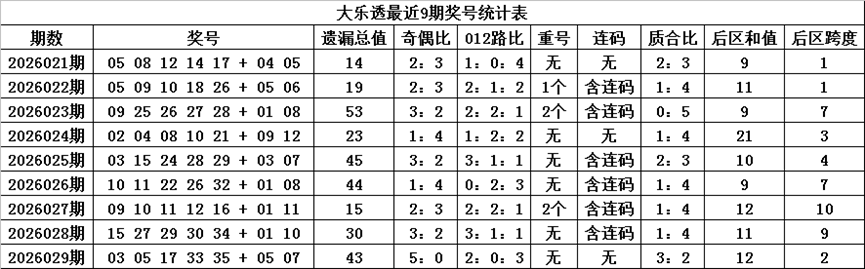 后区和值:上期后区和值开出12,和值上升1个点位,近9期和值分别开出:9、11、9、21、10、9、12、11、12,本期防和值重复出现。