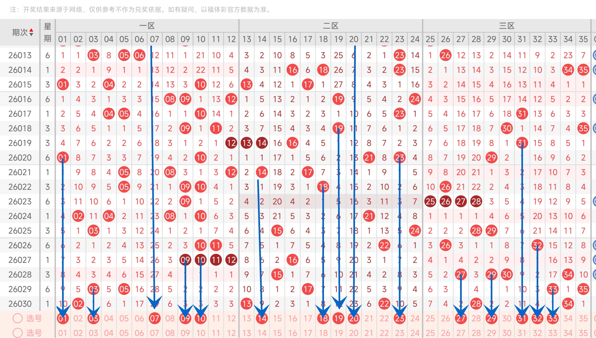 上期开了3234等号,往前一期开了3335等号。通过分析走势图,可以看到上期三区凤尾开34,推测本期凤尾可能会往中间移动,其次是左边的,也注意一下。最后再结合冷热号和遗漏期数,本期我们可以关注2729313233等号。综上所述本期三区我们推测可能会开2729313233等号码。