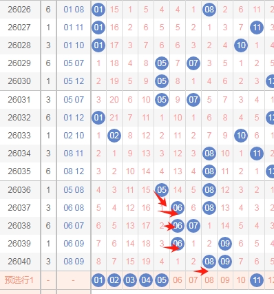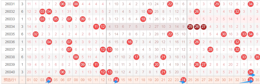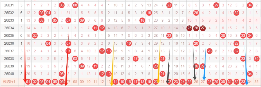 上图是体彩大乐透前区开奖号码走势分布图,我标志出来的红色箭头中间这个区域的数字01 02 03 04 05 06最近4期这个区域只开出一个数字,那么本期这个区域的数字可以关注出一个或者两个,我标志出来的黄色箭头中间这个区域的数字14 15 16 17 18 19 20最近4期只开出了两个数字,这个区域的数字有7个,那么本期这个区域的数字可以关注出2个或者3个,我标志出来的黑色箭头中间这个区域的数字22 23 24 25连续5期没出现号码,这个区域的数字本期关注出1个或者2个吧,还有我标志出来的蓝色箭头中间这个区域的数字28 29 30 31 32 33一共有6个,这6个数字连续两期没出现号码,本期关注这个区域的数字出2个或者3个吧。