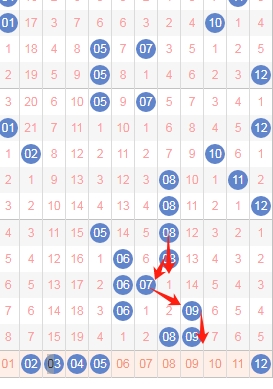 上图是体彩大乐透后区开奖号码走势分布图,我标志出来的红色箭头表示右边这个数字最近开出的跨度都小,那么本期右边这个数字可以关注出大跨度的数字,那么本期右边这个数字的范围就是02 03 04 05 12。