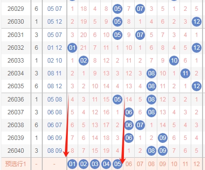 上图是体彩大乐透后区开奖号码走势分布图,我标志出来的红色箭头中间这个区域的数字01 02 03 04 05已经连续遗漏了4期,那么本期这个区域的数字开出的机会是有的,关注这个区域的数字01 02 03 04 05出一个或者两个。