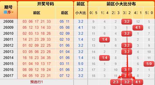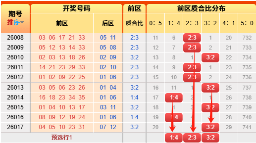 上期前区小大比3:2,依然命中。言归正传我们继续用历史数据说话,前区小大比分成6种0:5、1:4、2:3、3:2、4:1、5:0(如图),我统计了一下历史出现次数,0:5出现107次、1:4出现517次、2:3出现979次、3:2出现821次、4:1出现356次,5:0出现55次,再看近10期小大比出现次数比为0:2:0:6:1:1,通过历史数据对比观察以及根据遗漏对称理论原则,故本期我们选择2:3、3:2、1:4;(具体精准方向请查看小车小大比精选)