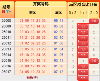 上期后区开出质合比为1:1,推测正确。