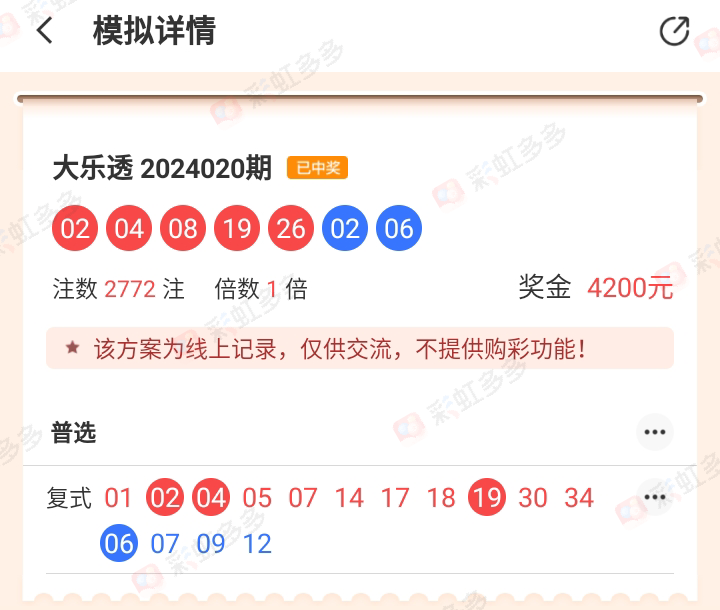 大乐透2024020期红球开奖号码为2 4 8 19 26,组合冷热码和值+5,2为其他类号码,4、8为主要号码,19、26为重号;29 30为孤号