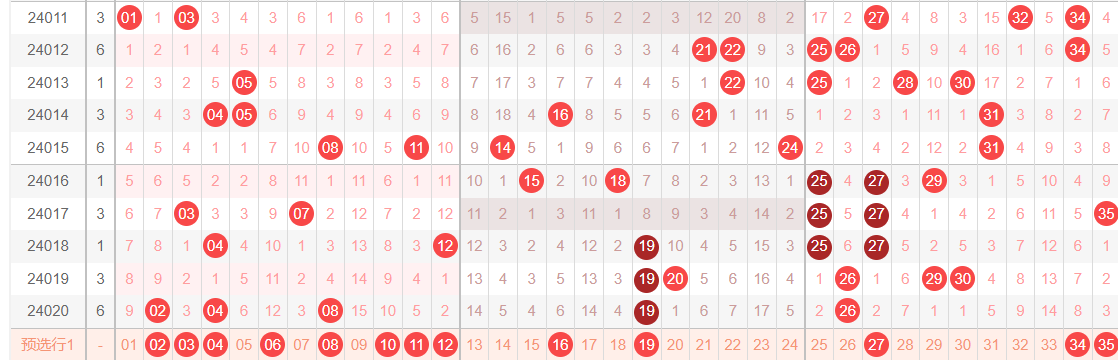接下来,其他与本期已间隔1~4期的号码与对应星期近30期一致的,可以作为主要号码进行选择,为3、7、12、15、18、20、25、27、29、30、35