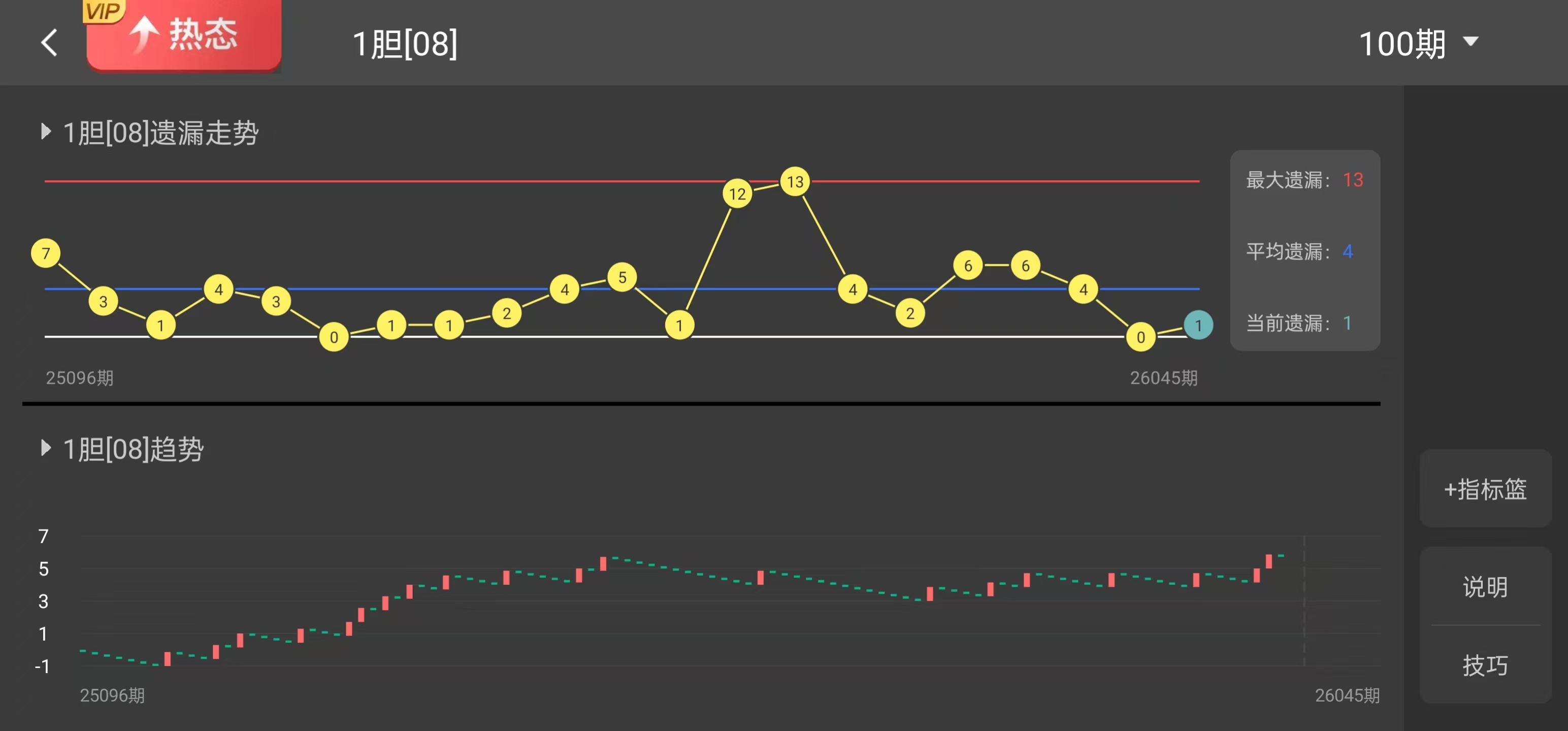 注解:定义(遗漏周期大于7为冷遗漏,号码呈现冷态,小于7为热遗漏,号码呈现温态,遗漏周期等于7,号码跳出冷热两态,我把它命名为图形态)