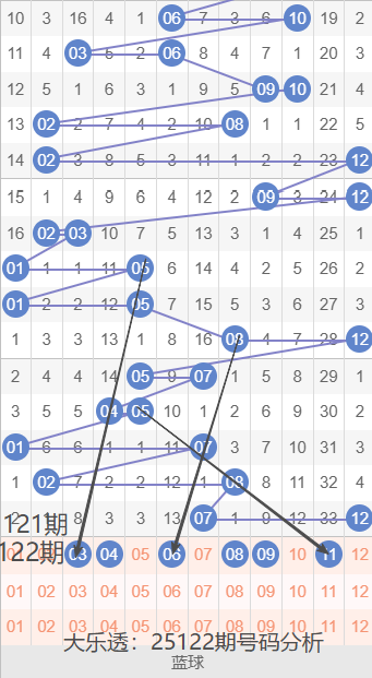 通过上期号码的简单分析,我们看下25122期红色号码球的总体走势,如下图: