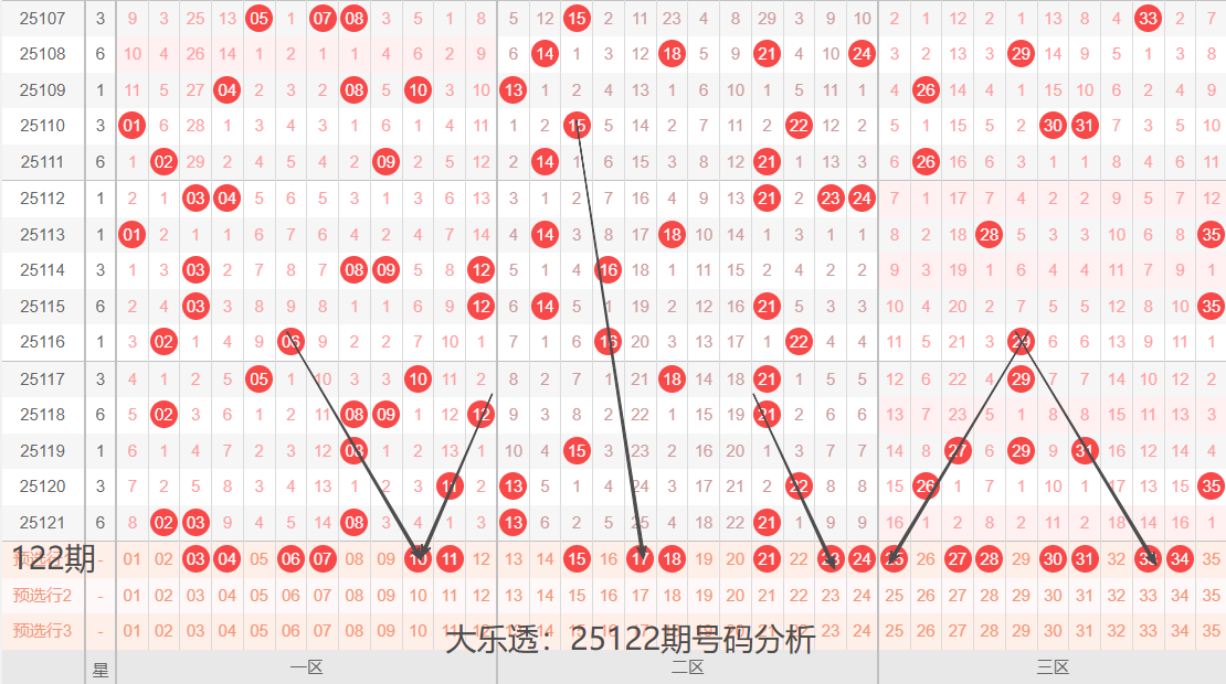 在以往大乐透开奖趋势中,号码联动、重号、斜连、冷号回补、遗漏1:2:3期间隔回补等走势非常明显,对我们来确定下期开奖号码非常有帮助,个人本期大乐透开奖号码前区预选范围如上图所示,充分考虑号码的各种走势,确定以下初选号码:03 04 06 07 10 11 15 17 18 21 23 24 25 27 28 30 31 33 34,参考分析如下: