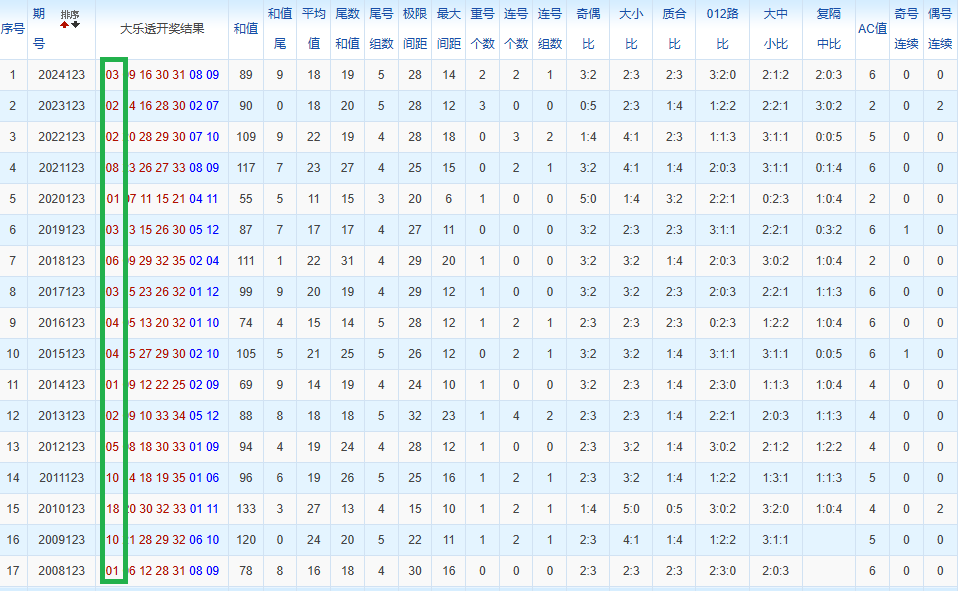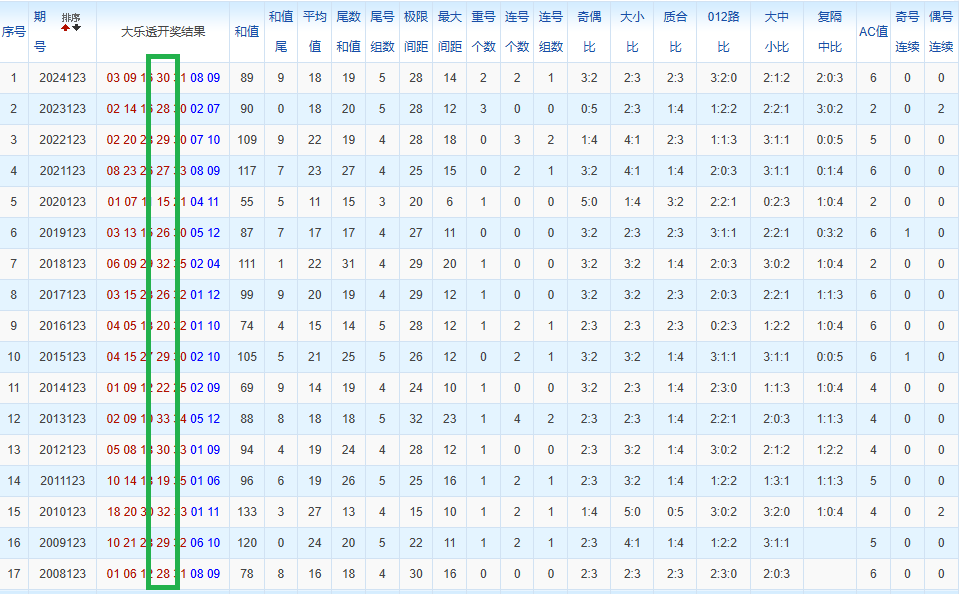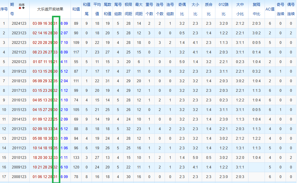 通过观察,我发现往年同期的开奖数据与本期号码之间存在显著关联。具体来说,在前区号码中,从第一位至第五位,通常会有约三个位置上的数字与往年同期相同位置的号码一致;而后区号码中,也有多期开奖结果直接包含了往年同期的数字。因此,我们可以借助往年同期各位置上的号码,作为分析本期开奖情况的重要依据。在此基础上,还可结合往年同期的其他相关条件,进行综合性的号码组合推荐。