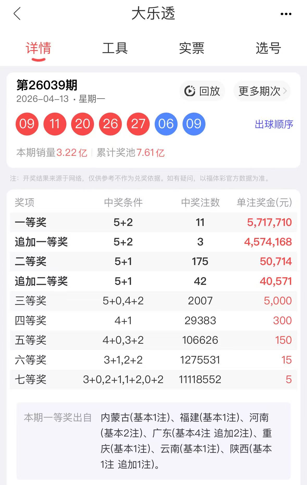 大乐透上期(26039期)开出中奖号码09、11、20、26、27+06、07。全国共开出一等奖11注,每注奖金5,717,710元钱,其中有三注为追加投注,每注多得奖金4,574,168元钱,二等奖共开出175注,每注奖金50,714元钱,其中有42注为追加投注,每注多得奖金40,571元钱。