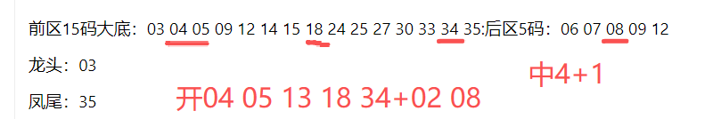 首先回顾大乐透上期开奖结果:04 05 13 18 34+02 08.上期命中4+1