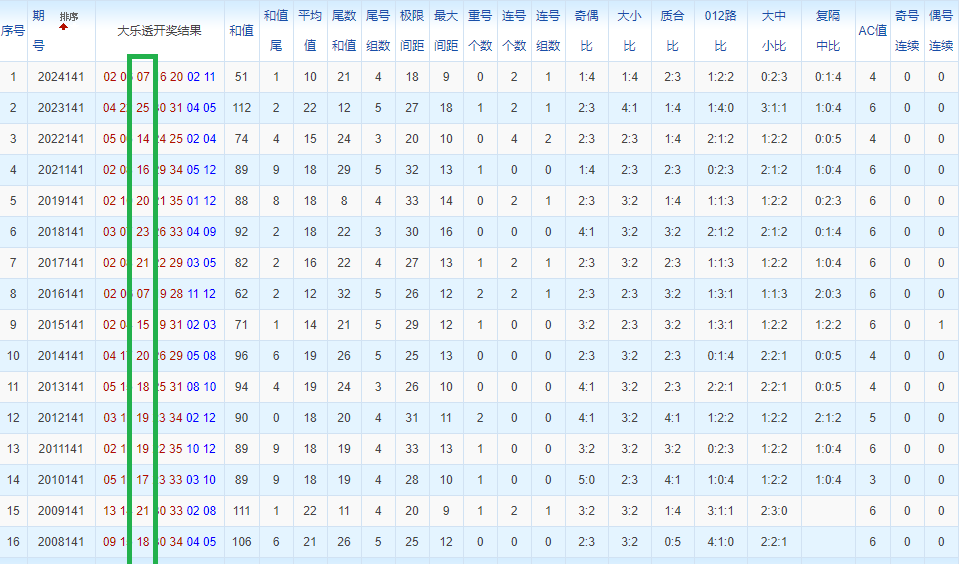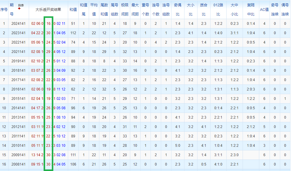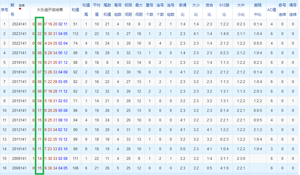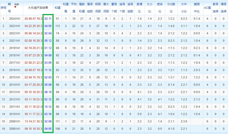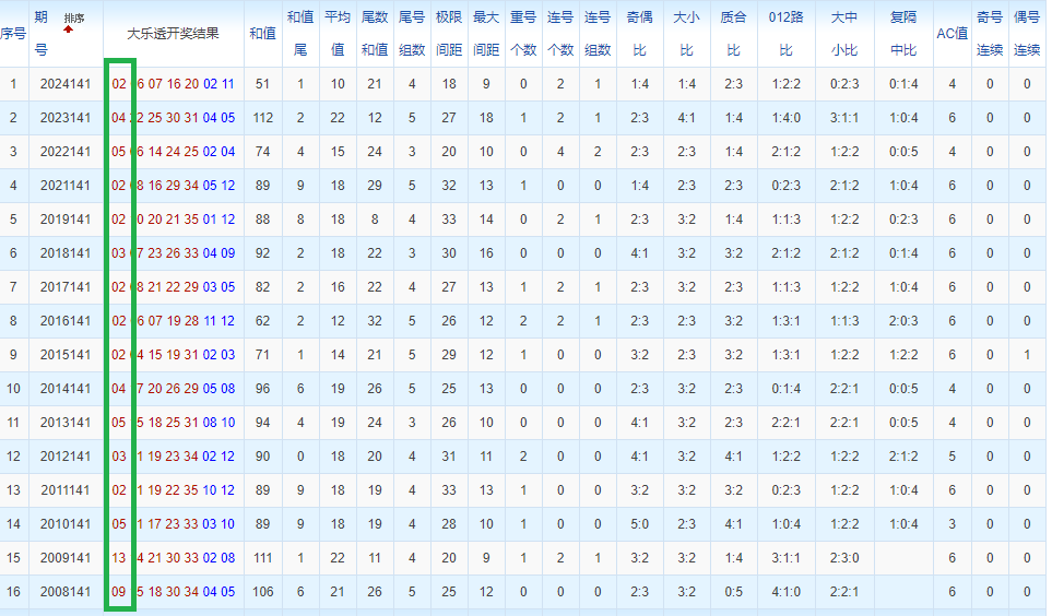 通过观察,我发现往年同期的开奖数据与本期号码之间存在显著关联。具体来说,在前区号码中,从第一位至第五位,通常会有约三个位置上的数字与往年同期相同位置的号码一致;而后区号码中,也有多期开奖结果直接包含了往年同期的数字。因此,我们可以借助往年同期各位置上的号码,作为分析本期开奖情况的重要依据。在此基础上,还可结合往年同期的其他相关条件,进行综合性的号码组合推荐。