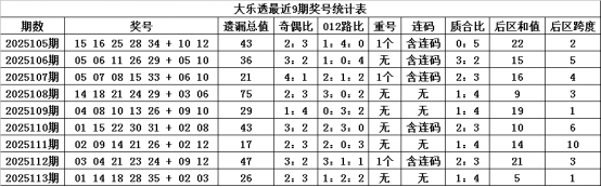 后区跨度:后区近9期跨度分别开出2-5-4-3-1-6-10-3-1,跨度奇偶比为5:4,上期跨度下降2个点位,本期防跨度重复出现1。