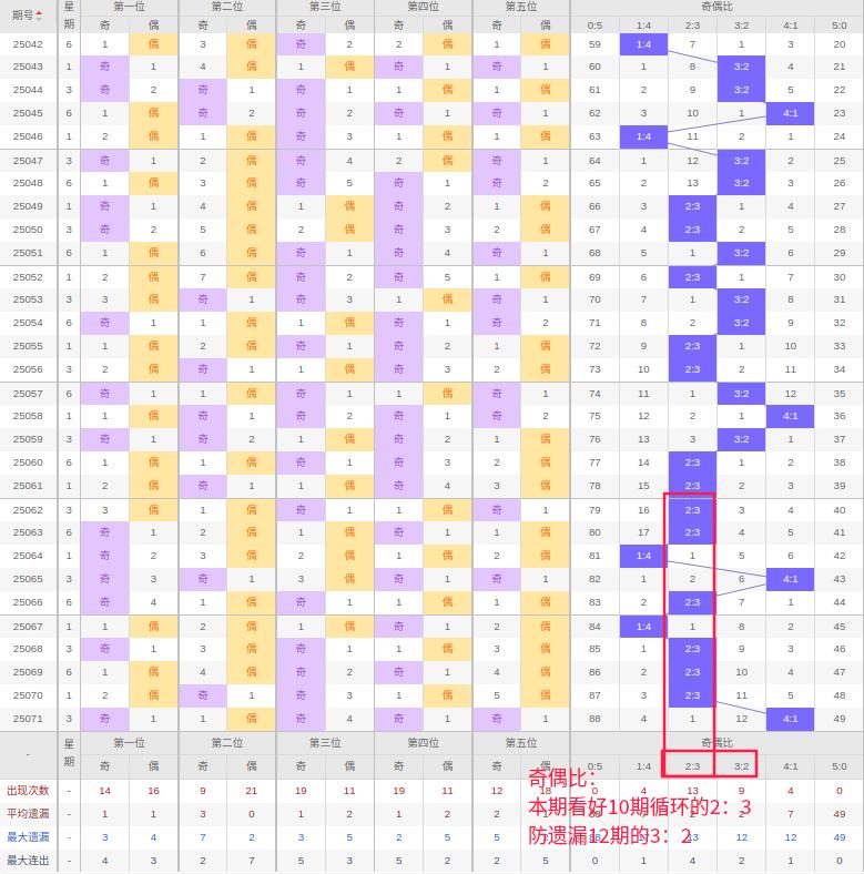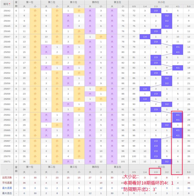 上期奇偶比:4:1,近10期奇偶比出现情况:2:3、2:3、1:4、4:1、2:3、1:4、2:3、2:3、2:3、4:1,最近10期出现0期3:2,出现6期2:3,出现2期4:1,出现2期1:4,出现0期5:0,出现0期0:5,根据近10期规律本期看好10期循环的2:3,防遗漏12期出3:2,综上所述推荐奇偶比推荐:3:2,重点关注:2:3。