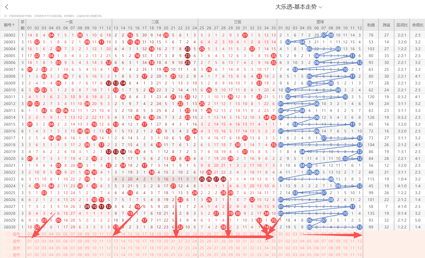1、前区特征分析:(通过整体走势不难看出每期开奖号都具备以下明显的特征点)