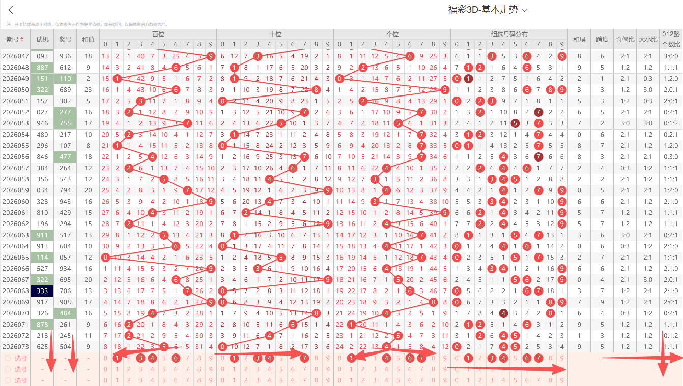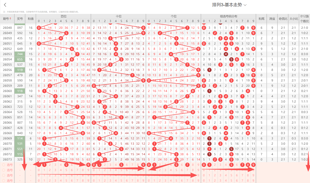 ①百位:上期开出小号奇数3号,在历史开奖记录中显示一般正常的奇偶周期平均在1~3期为普遍现象,奇数连续开出5期上期为0路号码依据奇偶以及012路周期性规律的转变特征点即本期1路号码有开出的趋势0路号码注意预防