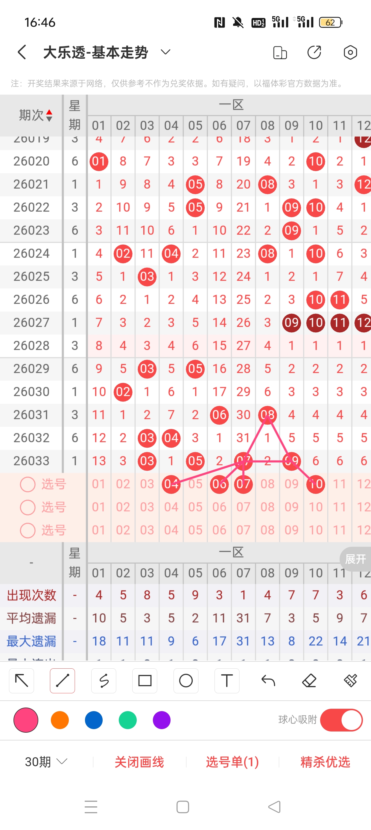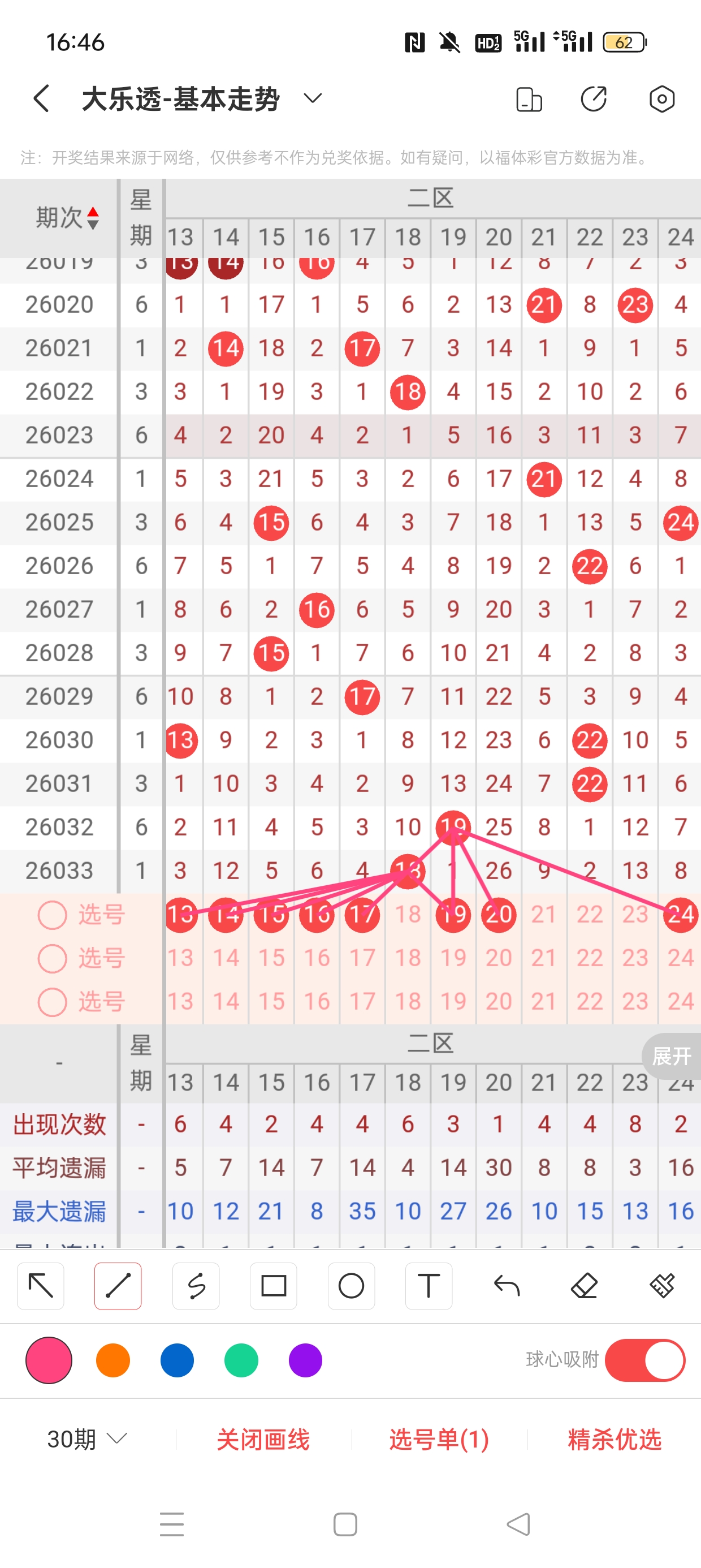 26033期开奖结果:3、5、7、9、18+2、10,奇偶比4:1,大小比0:5,和值42,012路3:1:1,邻孤传0邻4孤1传,同尾号无,传号3,连号无。总结完毕,下面开始本期分析。