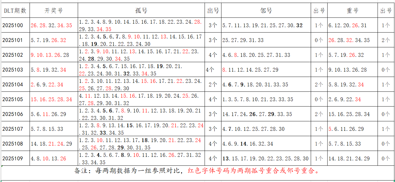 如图,以近两期数据为一组,进行对比分析,相同的孤号、邻号可能在下期开出。本期参考孤号:1.2.6.15.16.17.18.19.20.21.22.23.24.28.29.30.31.32.33.34.35;邻号:3.5.7.9.11.12.14.25.27。重点关注:孤邻号重合号码:***(会员专区可见)。个人分析,仅供参考。