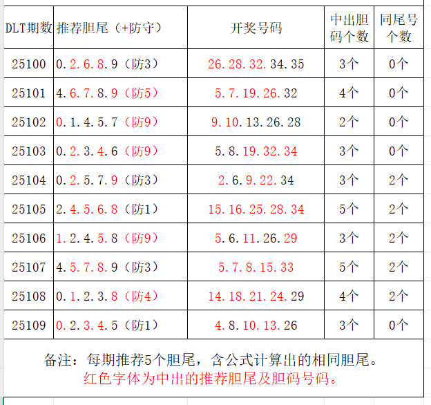 如图,每期推荐胆尾中出1-4个。上期推荐胆尾中出3尾3码!推荐胆尾是按照公式计算的顺序,不定位红球号码的顺序。本期推荐胆尾:1尾/0尾/3尾/9尾/6尾,加推防守胆尾+胆码号码:***(会员专区可见)。个人分析,仅供参考。