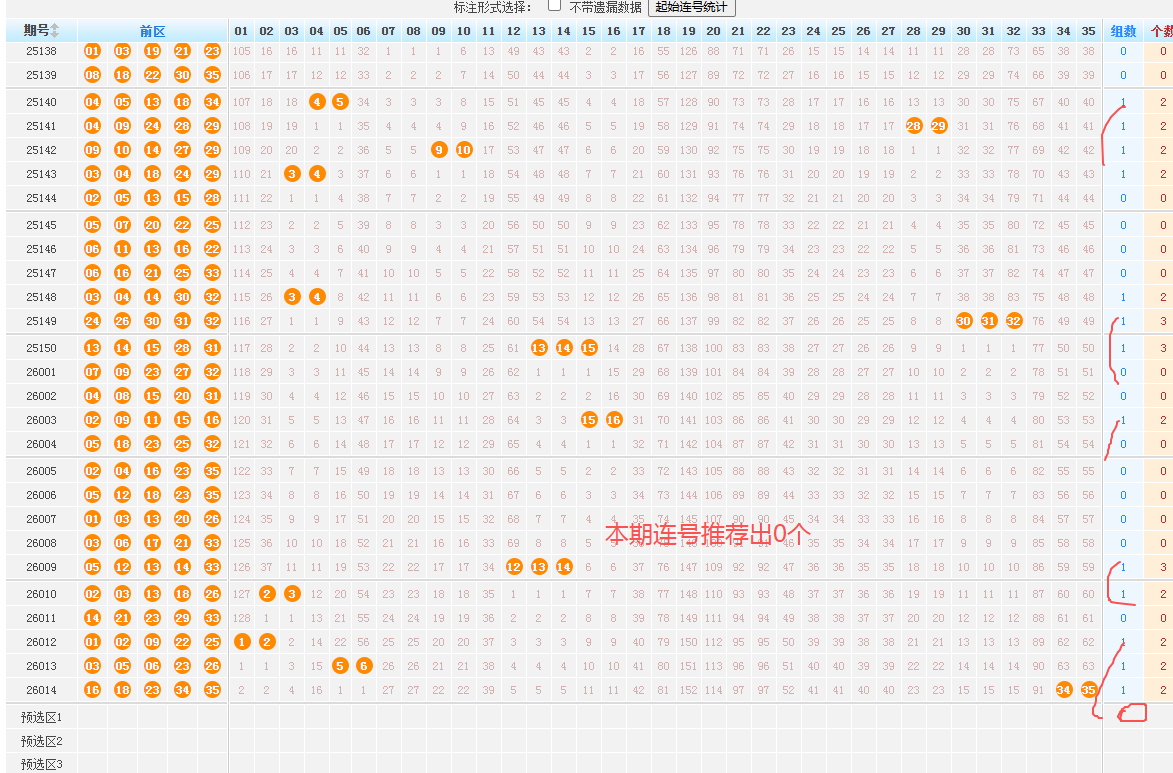 1、前区重号走势:上期前区开出0个重号,近97期出号个数为:-1-0-0-0-0-1-2-1-1-0-1-1-1-1-1-1-0-1-0-0-0-0-0-1-0-0-0-0-0-2-0-1-0-2-0-0-0-0-0-0-1-0-1-0-0-0-0-0-1-0-1-2-0-0-0-0-1-1-1-1-1-1-2-0-1-1-1-0-1-1-1-1-1-2-0-2-1-0-0-0-0-0-1-0-1-2-0-1-1-1-1-0-1-0- 0-0-1-,根据出出号有规律10001后紧随出-2-2-1-1-0-0-1-0-1-0-1-1-1-1-0-1-1-0-1-1,本期看好出0个,防出1个。