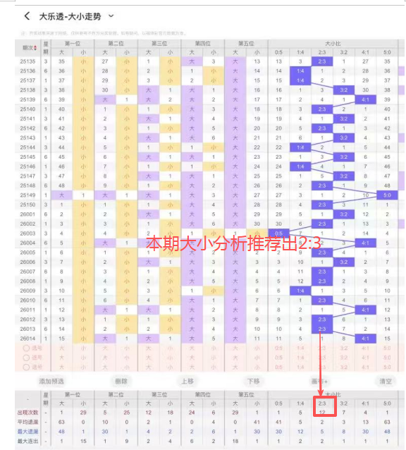 5、大小比:上期开出大小比为4:1,近109期开出4:1出现24次,3:2出现46次,2:3出现47次,1:4出现29次,5:0出现4次,本期推荐出2:3。