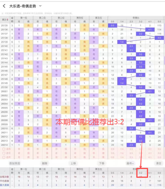 4、奇偶比:上期开出2个奇数,出3个偶数,奇偶比为2:3,整体看偶数强势,本期关注奇数继续出号,本期推荐出3:2。